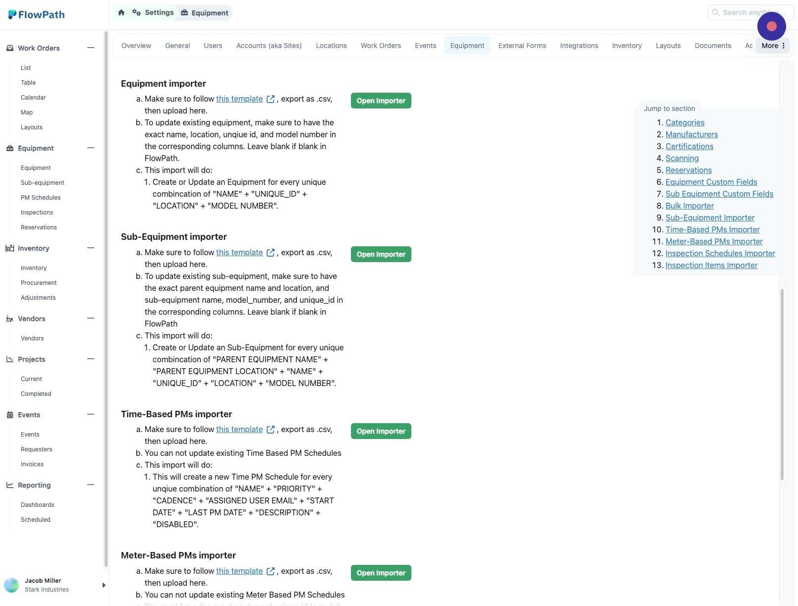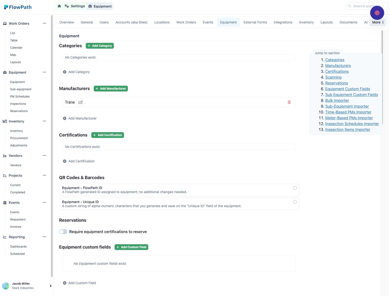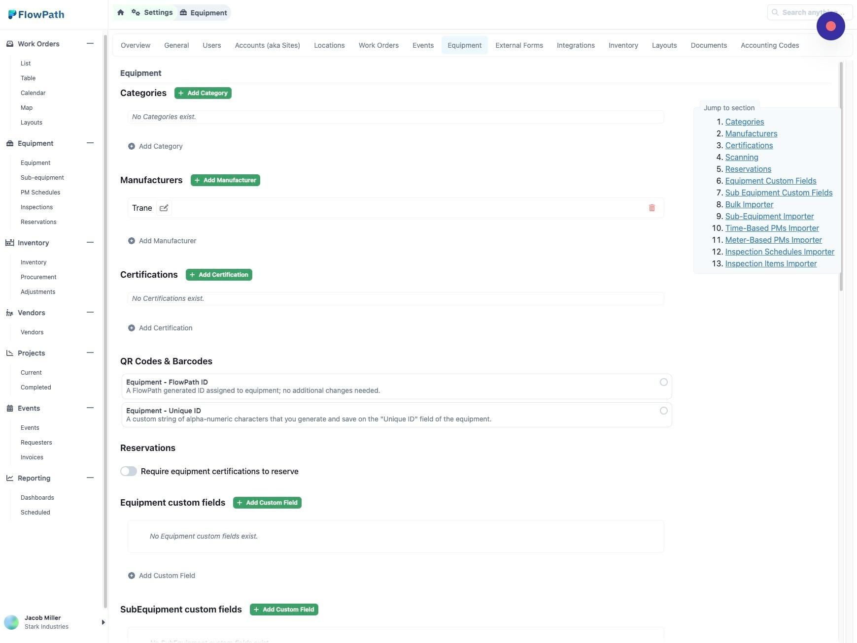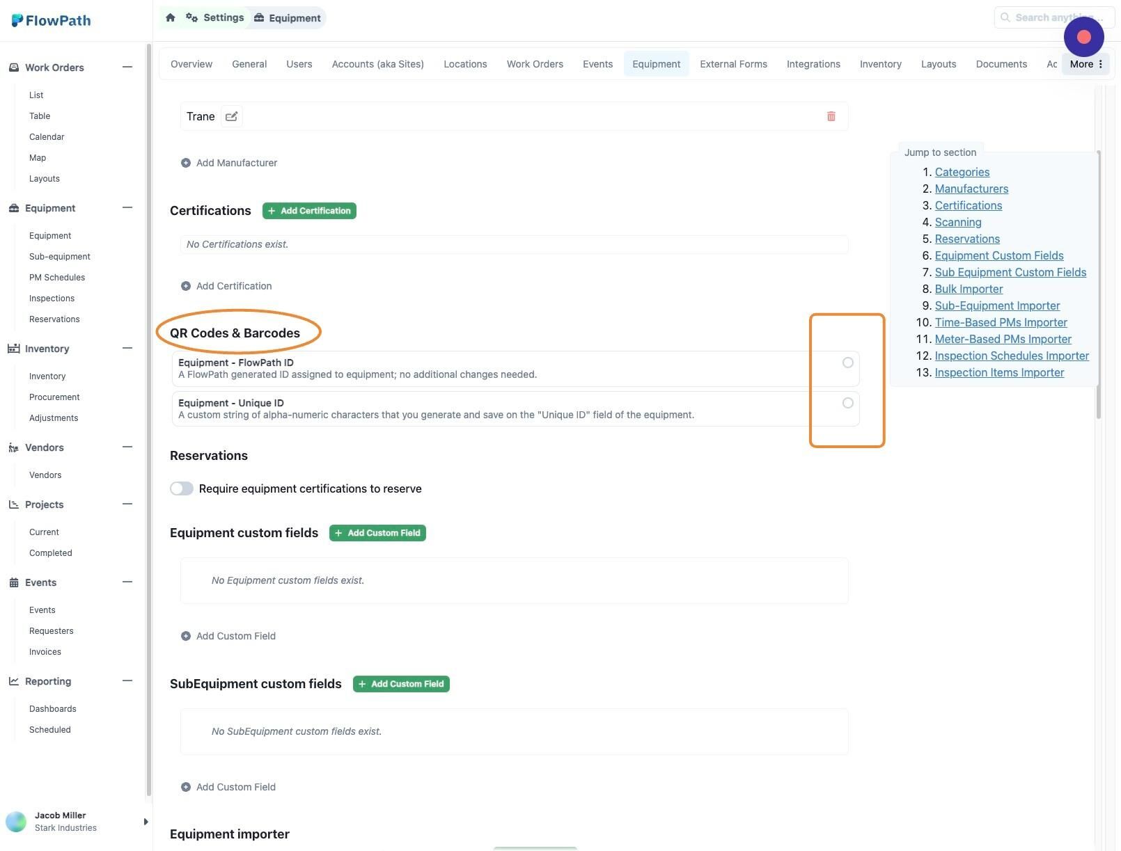50. Equipment tab is where you can add and delete equipment, manufactures you work with and generate QR/Bar codes.