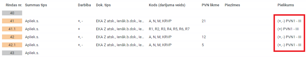 Lietotnē Jumis Finance PVN specifikācijā rindas numuram tiek piešķirta fona krāsa balstoties uz to, kādos pielikumos specifikācijā norādīts šos darījumus atšifrēt.
