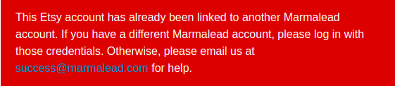 If you are seeing this error message (pictured below) when you try to connect your shop, it means that your Etsy shop has been connected to another Marmalead account before. You need to disconnect your Etsy shop from your other account first if you want to link it to your new one. If you don't recall having an old account with Marmalead, contact us for help!
