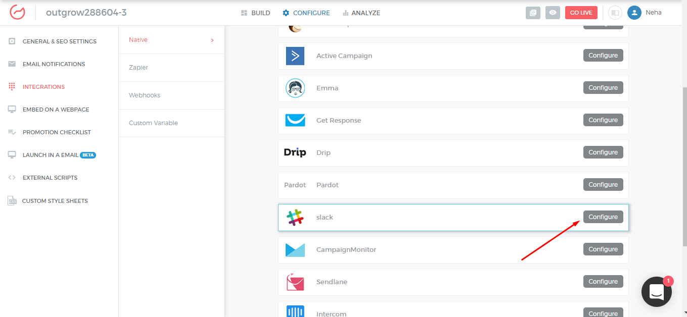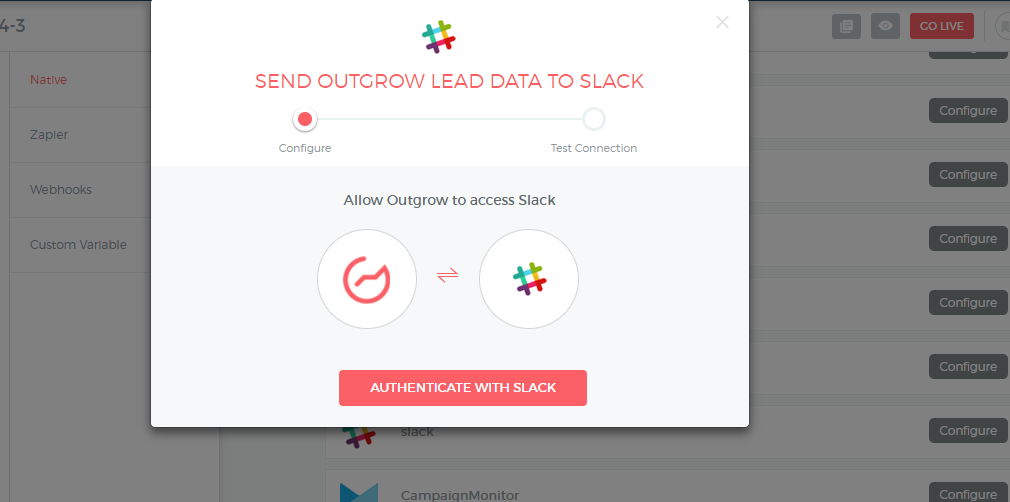 To access this integration, navigate to the Builder > Configure on your Outgrow interactive experience. Click the Configure button on Slack Integration.