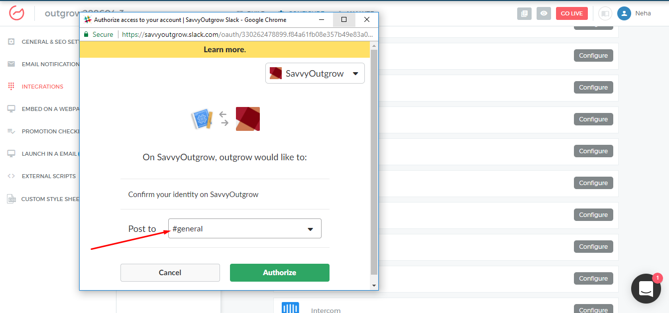 To configure Slack, you will have to authorize Outgrow to access Slack.