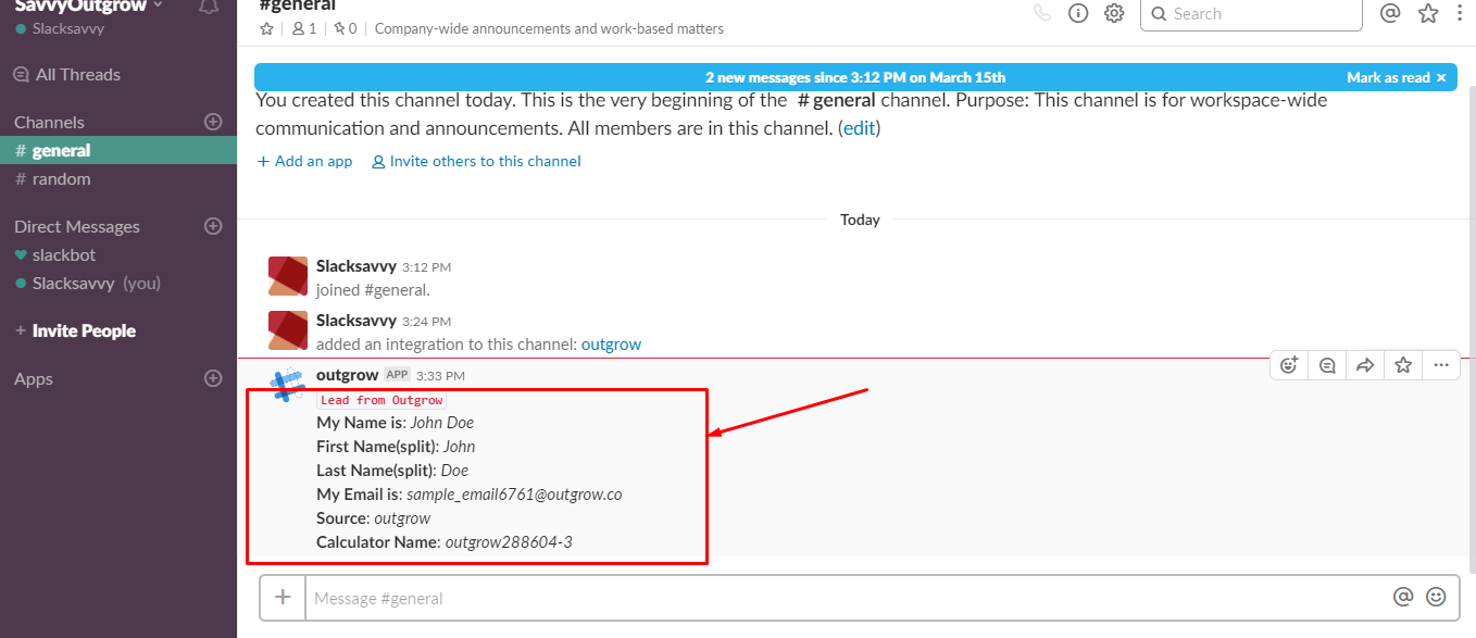 You can check the lead sent from Outgrow on your Slack channel.