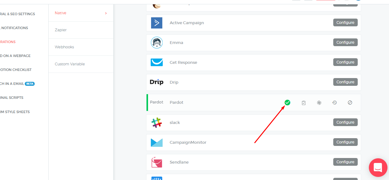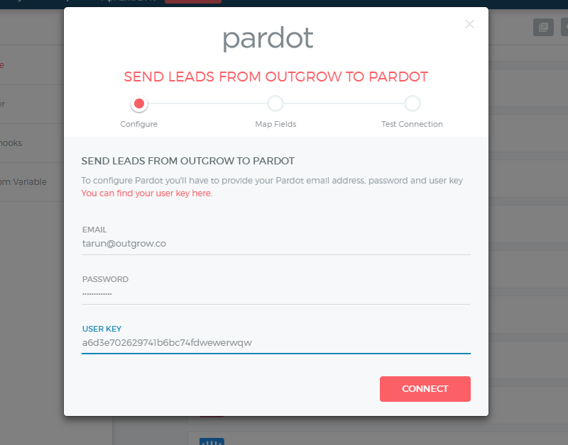 Re-configure- In case your Pardot credentials have changed or you want to connect Outgrow with a different Pardot account then you will have to Reconfigure your Pardot integration to continue getting Outgrow leads in your Pardot account. If you have collected some leads on Outgrow but don't see them on Pardot then you should definitely try to Reconfigure once to fix it yourself. If that doesn't help then drop us an email with your query at questions@outgrow.co.
