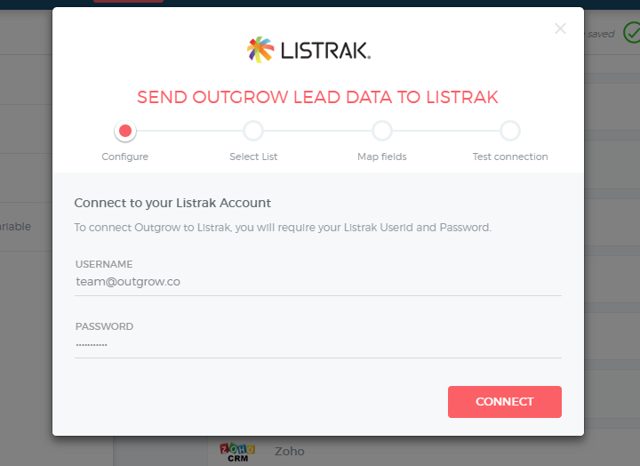 Re-configure- In case your Listrak credentials have changed or you want to connect Outgrow with a different Listrak account then you will have to Reconfigure your Listrak integration to continue getting Outgrow leads in your Listrak account. If you have collected some leads on Outgrow but don't see them on Listrak then you should definitely try to Reconfigure once to fix it yourself. If that doesn't help then drop us an email with your query at questions@outgrow.co.