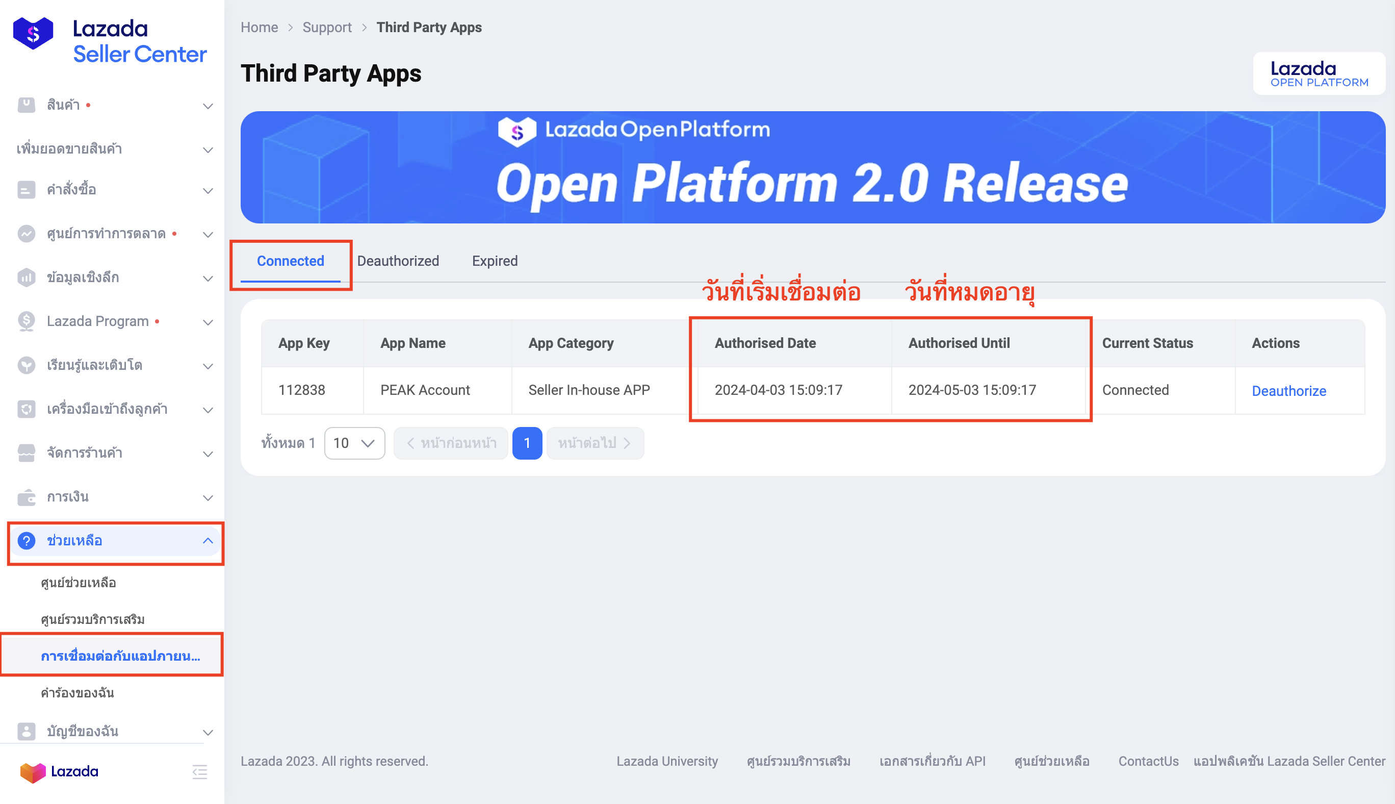 เนื่องจาก Lazada มีการปรับนโยบายใหม่ ให้การเชื่อมต่อ API กับโปรแกรมภายนอกทุกโปรแกรม(รวมถึง PEAK) มีอายุการเชื่อมต่อ 30 วันค่ะ เมื่อครบอายุแล้วจะต้องเชื่อมต่อใหม่
