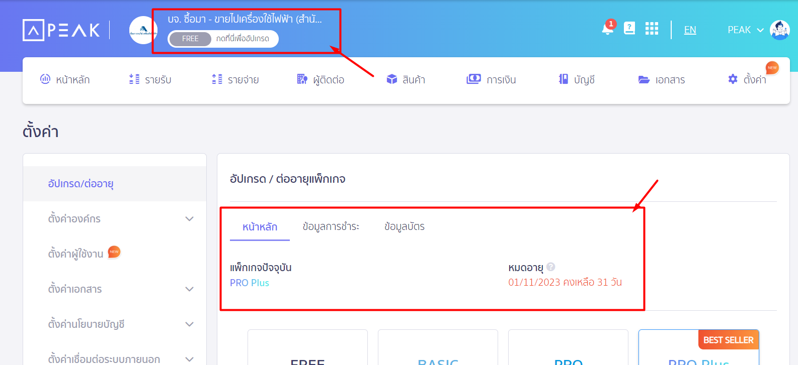 เช่น ปัจจุบันใช้แพ็กเกจ Basic แต่ต้องการเปลี่ยนไปใช้แพ็กเกจ Pro Plus