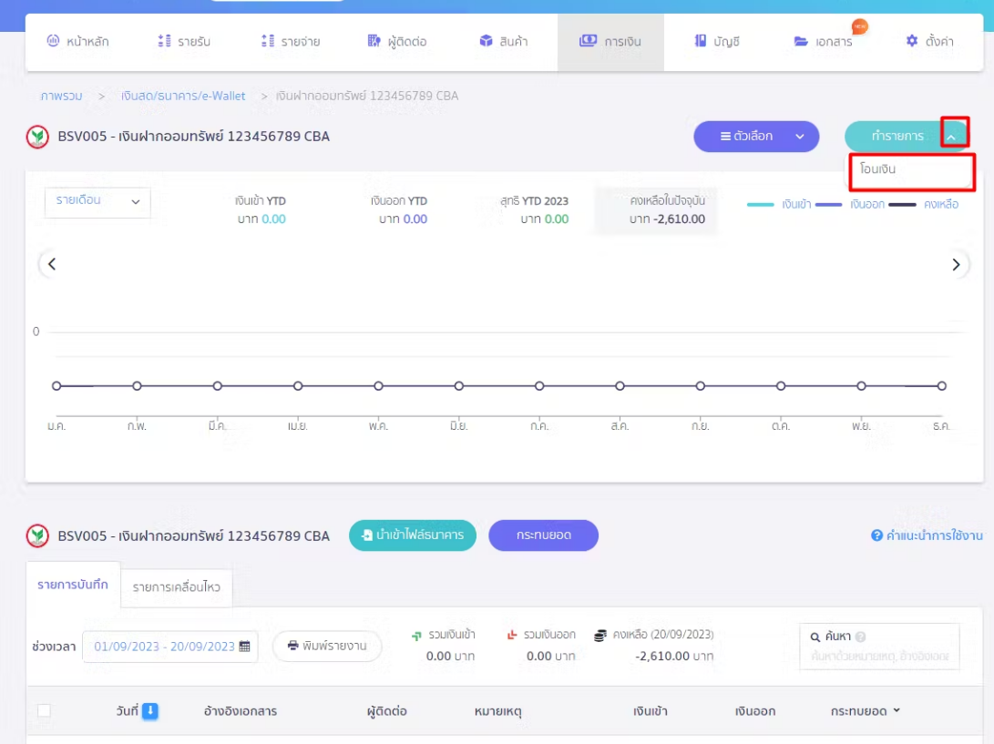 กดคลิกเครื่องหมาย Dropdown ปุ่มทำรายการ เลือก โอนเงิน