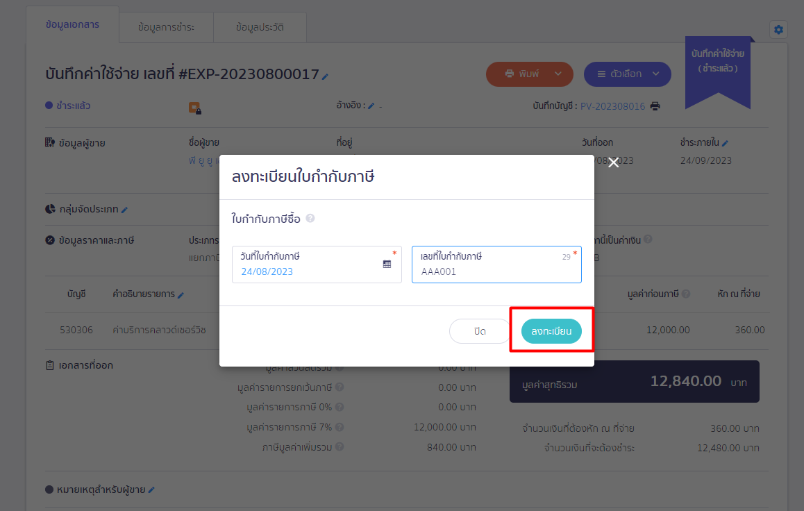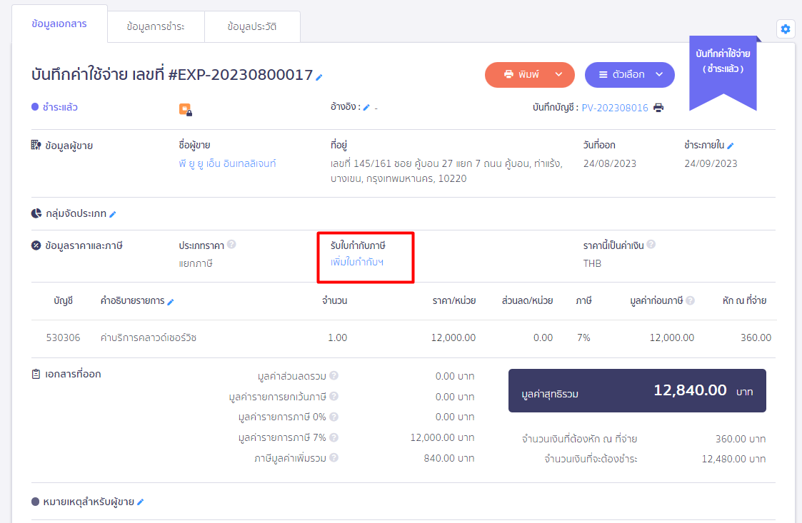 เมื่อบันทึกค่าใช้จ่ายที่มี VAT ใน PEAK ระบบจะบันทึกบัญชีรายการ VAT เป็นภาษีซื้อไม่ถึงกำหนดให้อัตโนมัติ เมื่อกดปุ่ม “เพิ่มใบกำกับฯ” ในหน้าบันทึกค่าใช้จ่าย เพียงแค่ระบุวันที่ และเลขที่ใบกำกับภาษีซื้อ ระบบจะบันทึกภาษีซื้อให้เลยทันที