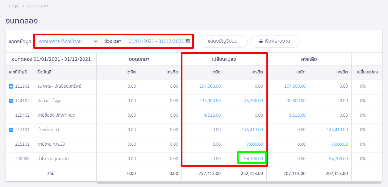 กำหนด วันที่ 01 มกราคม 2021 - 31 ธันวาคม 2021 จะเป็นกำไรสะสม ณ วันที่ 31 ธันวาคม 2021 ให้ดูที่ผังบัญชีกำไรสะสม (330000) ตรงช่องการเปลี่ยนแปลง จะเป็นกำไรสะสมที่เกิดในงวดนั้น ๆ