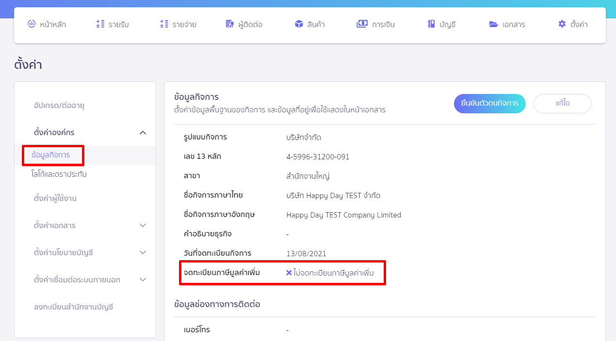 สาเหตุเกิดจาก : ข้อมูลกิจการยังไม่เลือกว่าเป็นกิจการที่จดทะเบียนภาษีมูลค่าเพิ่ม