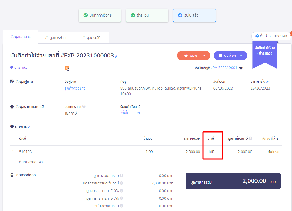 ตรวจสอบเอกสารบันทึกค่าใช้จ่าย โดยเช็คที่ช่องภาษีว่าได้มีการระบุภาษีไว้หรือไม่ เมื่อตรวจสอบแล้วต้องการแก้ไขเอกสารดูวิธีการแก้ไขที่นี่