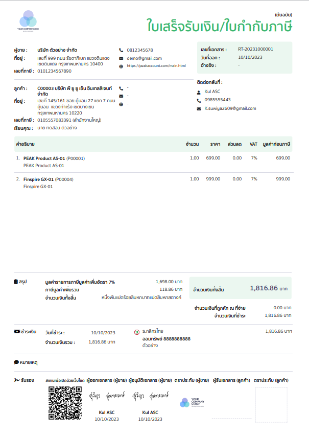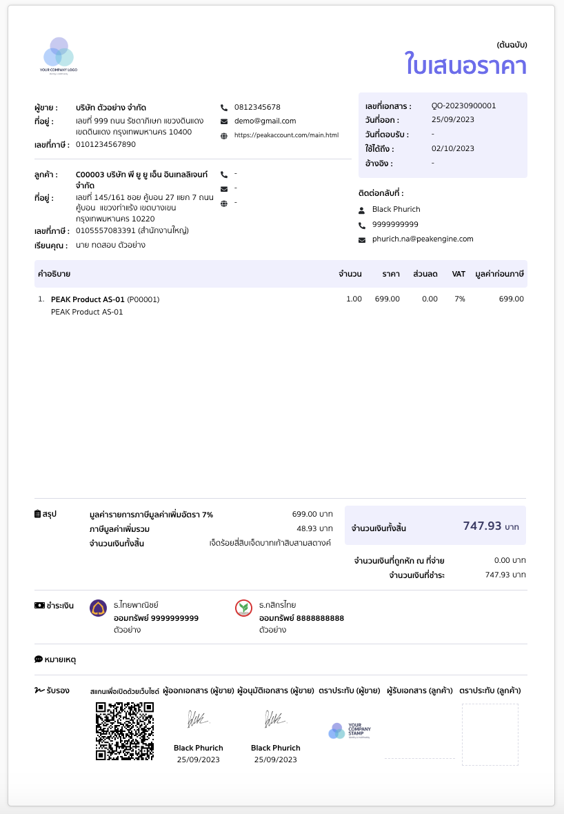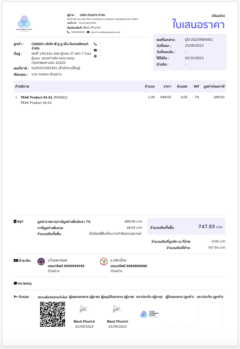 แต่ถ้าหากคุณมีรูปแบบฟอร์มเอกสารของกิจการอยู่แล้ว สามารถใช้บริการ Customize เอกสารจาก PEAK ได้ค่ะ จะมีค่าใช้จ่ายเพิ่มเติม หากสนใจสามารถติดต่อ Support PEAK ที่แชท หรือโทรที่ 1485 กด 3