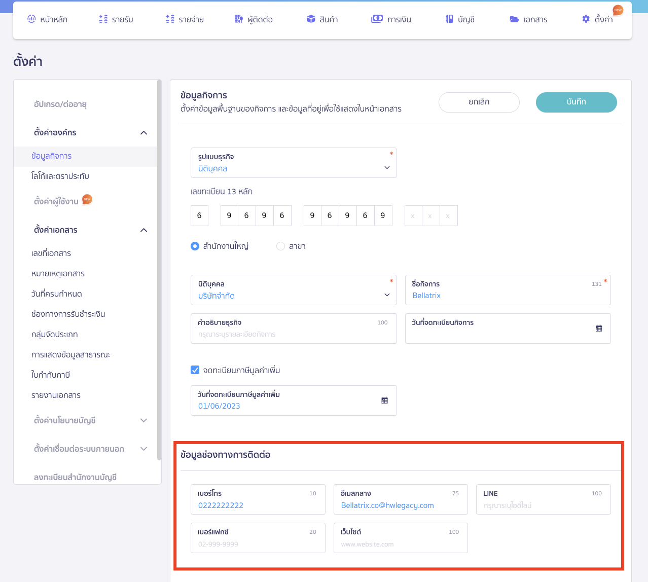 หากผู้ใช้งานต้องการเพิ่มข้อมูลการติดต่อกลับให้แสดงที่หน้าเอกสารเมื่อมีการออกเอกสารให้กับทางลูกค้า สามารถเพิ่มได้ที่ เมนูตั้งค่า > ตั้งค่าองค์กร > ข้อมูลกิจการ > กดแก้ไข > ระบุเบอร์โทรหรือข้อมูลการติดต่อกลับ