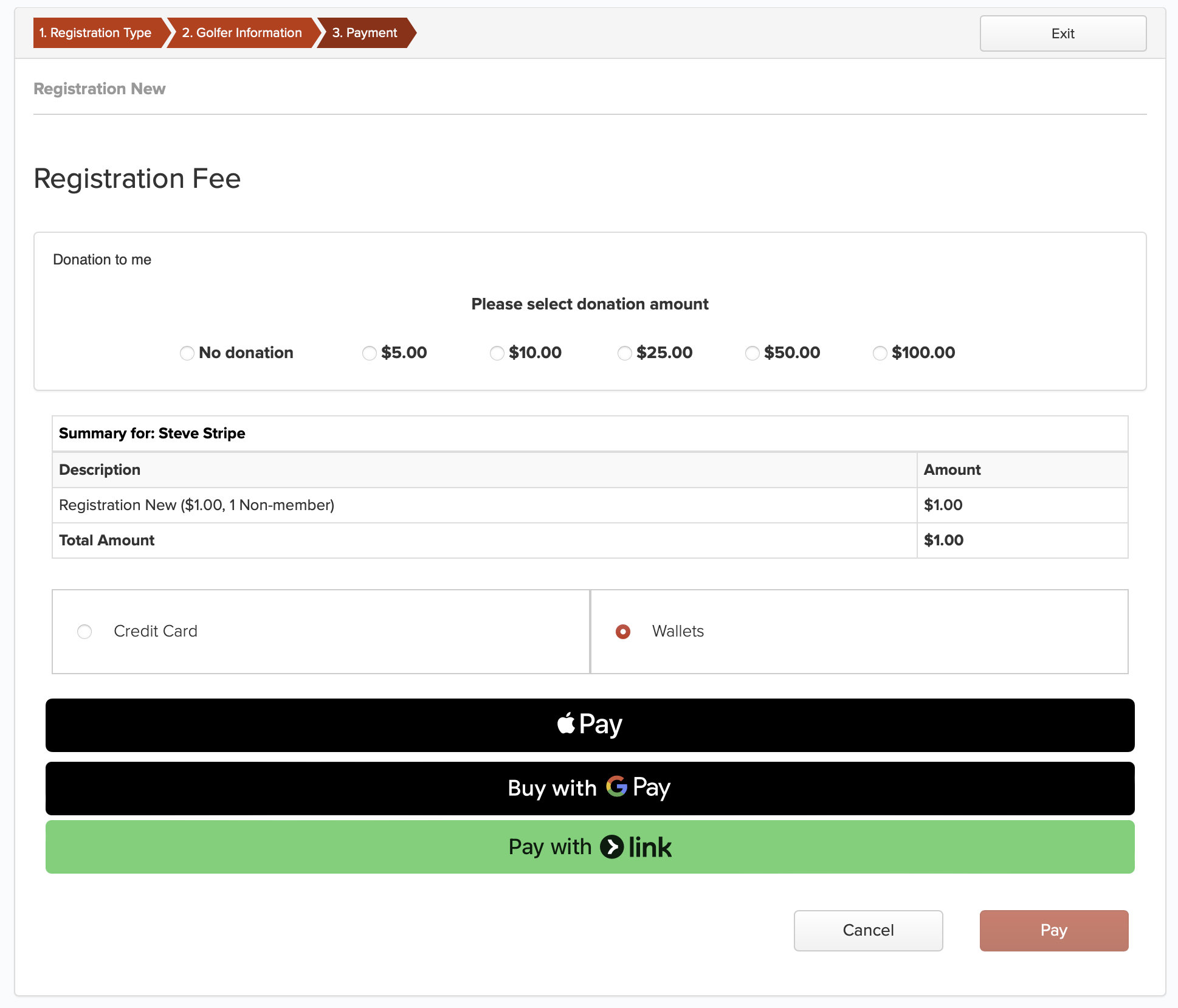 A: On the payment page during registration, they can select "Wallets" (as shown below), allowing them to pay using Google Pay and Apple Pay. Note: Not all payment methods are available on all devices (e.g., iPhone, Android Phone) or web browsers (e.g., Safari, Chrome, etc.).